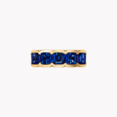 The Alexa pinky ring with 5 asscher cut blue sapphires set in a handmade 18K yellow or rose gold band. This ring is a modern play on deco-inspired artistry, with its ultra-thin half bezel setting showcasing each stone’s unique shape. To embrace the opulence of this vintage inspired design, don’t be afraid to mix styles with your stack.