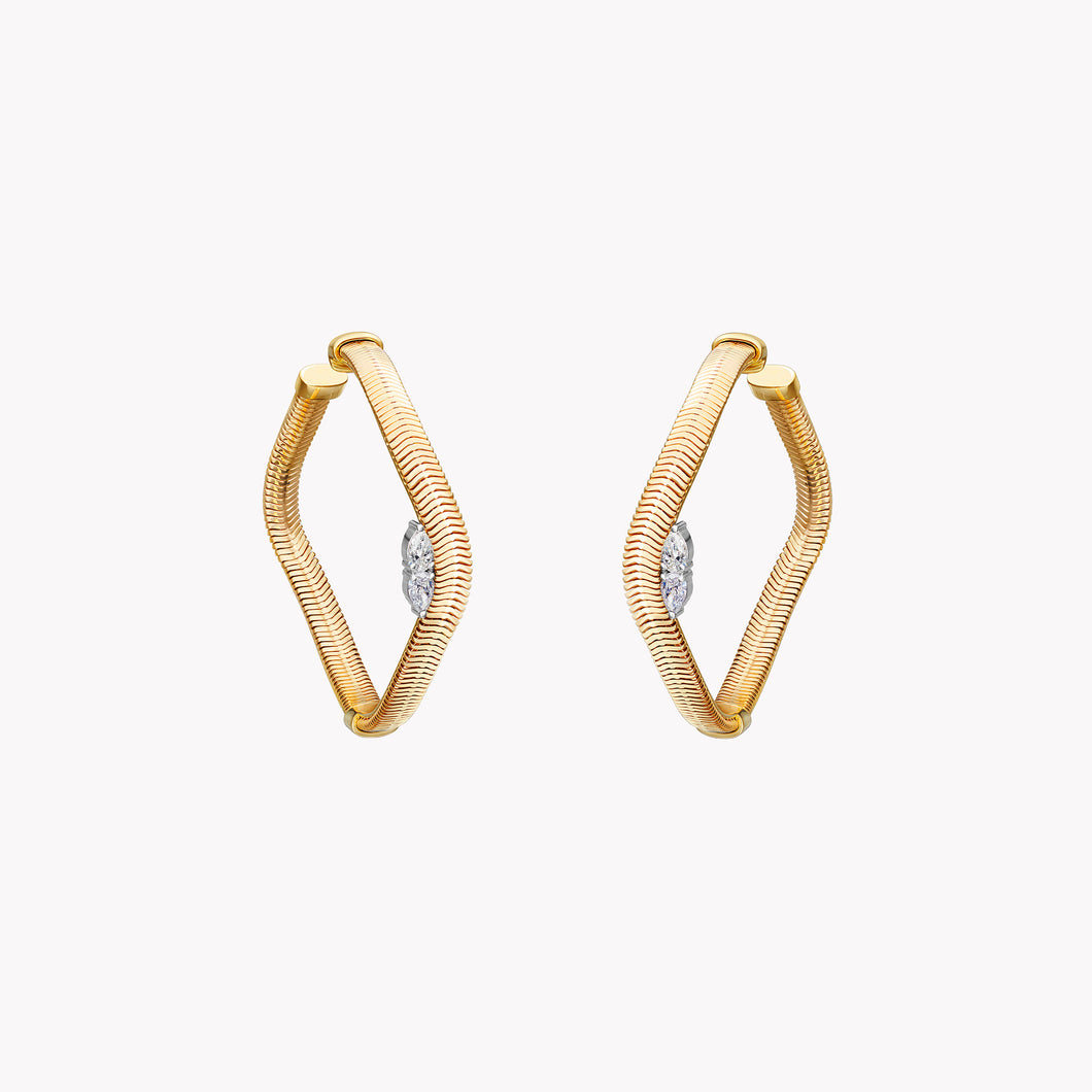 A staple from the Feelings Collection these elongated hoops feature pear shape diamonds seamlessly fused with yellow gold snake chain detailing. A prime example of Nikos Koulis' master craftsmanship, this delicate yet striking design blends subtle texture with a timeless silhouette. This showstopping hoop is an effortless choice for special occasions, and an eye-catching addition to your everyday repertoire.Product Details