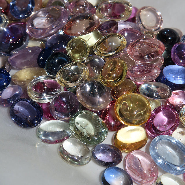 The resulting cool-toned blue sapphire necklace channels organic waves and tidal pools, an homage to the ocean and cloudless sunny skies. A 4.30 carat oval sapphire is set in an organic-shaped yellow gold bezel setting, enhanced with cobblestone pave of varying-sized white diamonds whose dimensions and sparkle mimic a droplet in a rippling pool of water. Every detail, down to the one-of-a-kind chain sourced specifically for this piece, was hand-selected and crafted by MG.