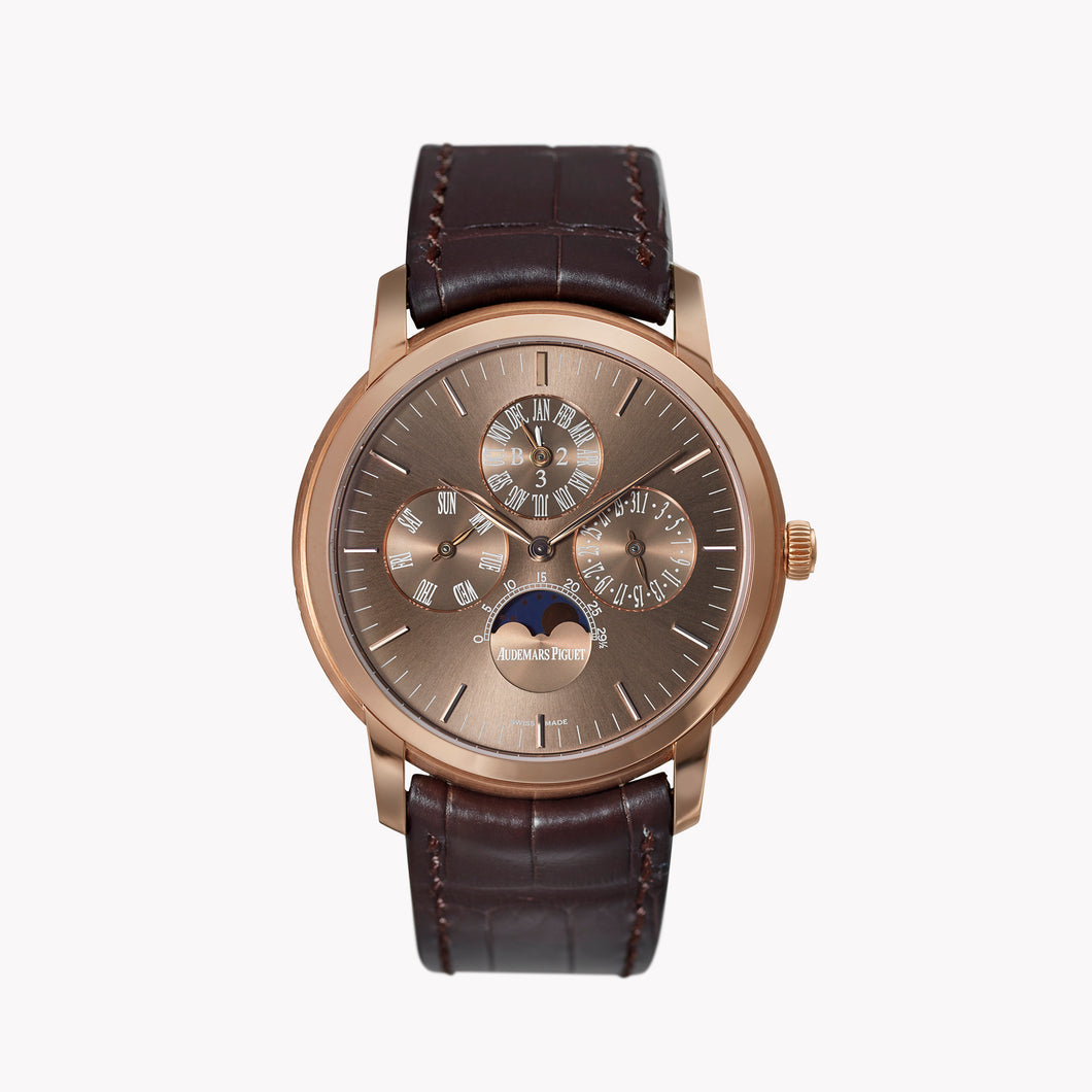 Audemars Piguet was founded in 1875, making it one of the world's oldest watch manufacturers. The Jules Audemars collection reflects the more traditional side of Haute Horology, paying respect to their esteemed history through elegant timepieces emphasizing classical styling and more intricate complications. This beautiful perpetual calendar reference comes in a rose gold case with a brown dial, pink gold applied hour-markers and hands, and a hand-stitched black alligator strap.