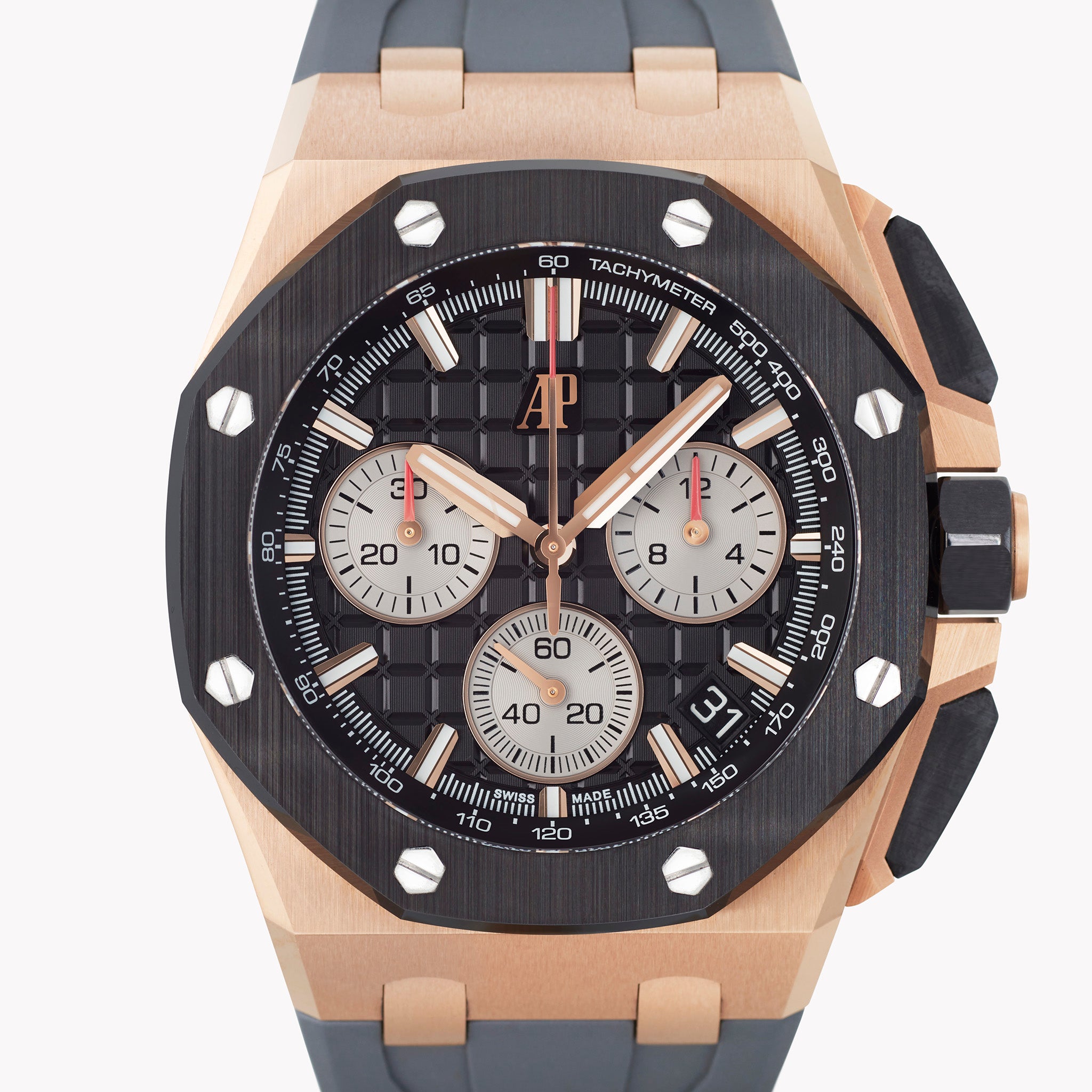 In 1993, the launch of the Royal Oak Offshore marked a significant evolution, adding an exciting new dimension to the iconic Royal Oak. The Offshore expanded the horizons of watchmaking by introducing innovative materials, larger sizes, and enhanced sporty features.This selfwinding, flyback chronograph showcases a rose gold case and pin buckle, with the crown and chronograph pushers made from black ceramic. Audemars Piguet's innovative quick-change strap system enables the wearer to effortlessly switch the strap's color and material.