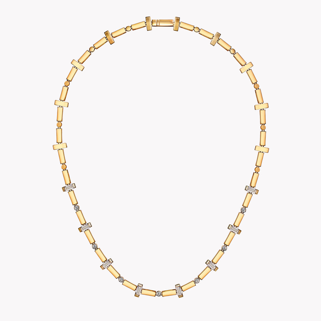 Āzlee is a master of craftsmanship and artistry. This design combines contemporary glamour with the architectural lines of the art-deco movement. Add dimensionality to your stack with this modern staple. For an elegant pairing, style with the ĀZLEE Gold Bar and Carre Diamond Staircase earrings.