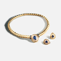 • This bold sapphire and diamond collar necklace with its matching earrings is a true example of 1980’s decadence, while maintaining a timeless quality that makes this set perfect to wear today.  The wide articulated yellow gold collar necklace features raised pave set diamond details for an added element of 80’s aesthetic. Channel set calibre cut blue sapphires frame the centerpiece: a navy blue oval cut sapphire surrounded by round white diamonds.  Matching earrings featuring navy blue oval cut sapphires surrounded by round white diamonds, also set in warm yellow gold, complete the unforgettable look.