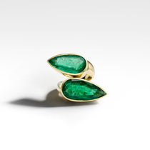 Turn heads with the bold size of this circa 1990’s double emerald bypass ring. Weighing a total of approximately 15.40 carats, the two giant emerald pears, likely of Zambian origin, have distinctive long and lean shapes that take this design to the next level. The emeralds are bezel set in warm 18k yellow gold settings that wrap perfectly around the finger. Please note this ring is currently a finger size 6.25 and cannot be adjusted.