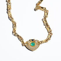 Circa 1980’s, this bold necklace is the ultimate statement piece. A bright green cabochon cut emerald center stone is surrounded by pave white diamonds in a pendant reminiscent of a heart shape, and topped with baguette cut dark blue sapphires for another pop of color. The heavy links feature connectors of 18k white and rose gold in the same shape as the pendant, which is an unexpectedly fun detail in a piece that is primarily 18k yellow gold. This necklace is just as easily worn with jeans and a white tee as it is dressed up for a cocktail event.