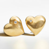 A sweet pair of 18k yellow gold domed heart shape earrings, circa 1990, is accentuated by one bezel-set round brilliant diamond per heart, weighing a total of approximately 0.15 carats.  Perfectly oversized, these asymmetrical hearts are the perfect finishing touch to any outfit.